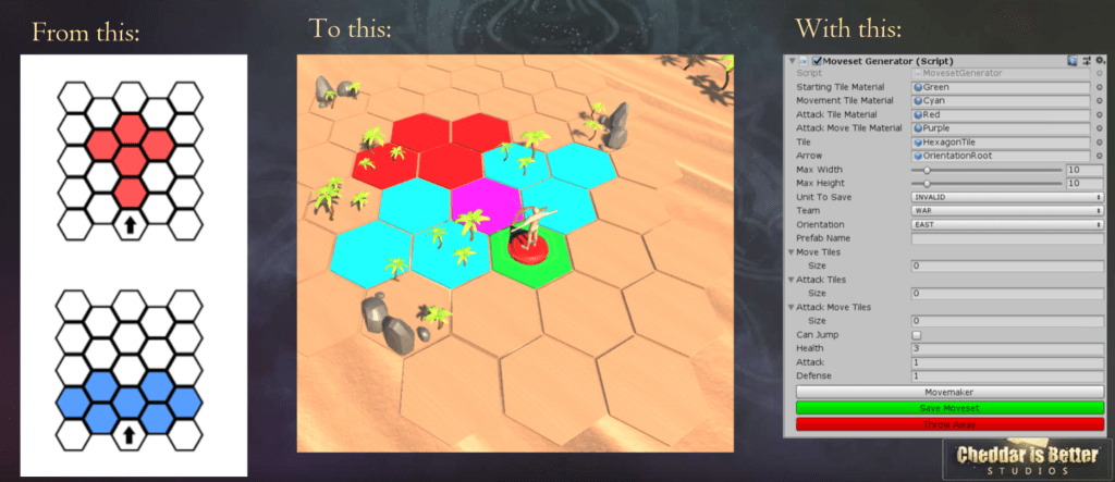 The position it’s in is based on the health it’s currently and if it can reach a nearby shrine and/or biome tile. I created a heatmap for the possible tiles everyone can move and attack to. This is the second part of the setup for the algorithm. This tells the AI where it is best suited to move to. This causes the player’s opponents to sometimes flank the player and move behind where the player’s pieces are currently facing.