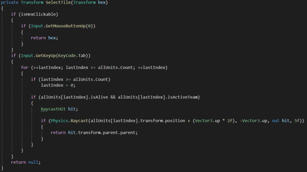 The player can either click on the tile they want to select or they can tab through their units. These are separated into 2 different functions.