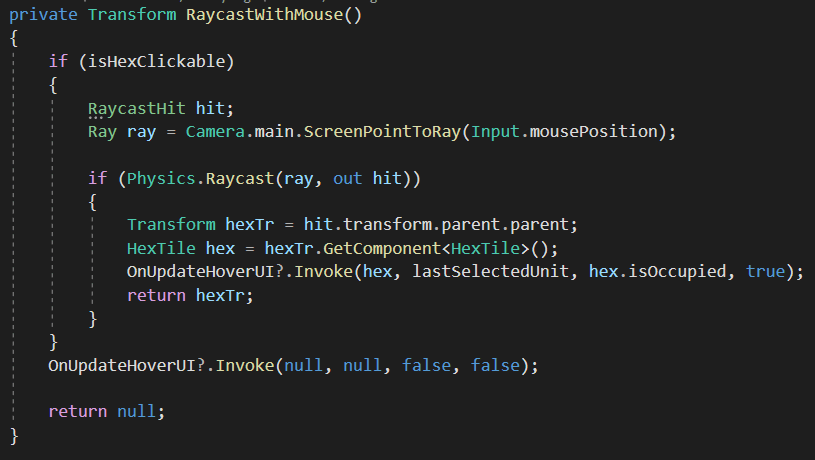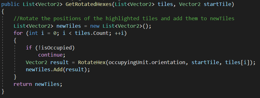 The UI/UX in this game is the game. The scrollable field and formations are the obvious UI choices in the game because they stand out. However, all the hex tile color changes are done in a complex way. I could not have done this project without one resource, https://www.redblobgames.com/grids/hexagons/. This was a savior during all stages of production and definitely deserves some praise. I used the axial coordinate system as the main way to reference hexes. In the map maker tool, they are instantiated in an odd-row horizontal layout, then translated to an axial coordinate to get the name of the tile. Only when the user wants to rotate a piece is it ever referencing something other than axial coordinates. I take the axial coordinate of the tile and rotate it using cube coordinates. Then I get translate the cube coordinate back to axial coordinate to get the tile.