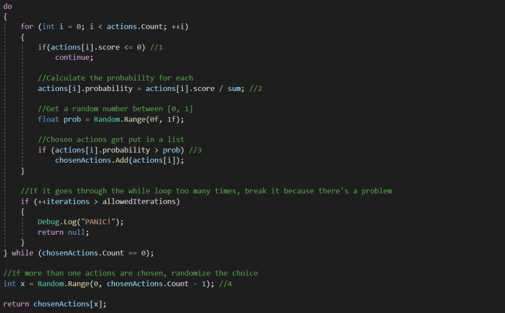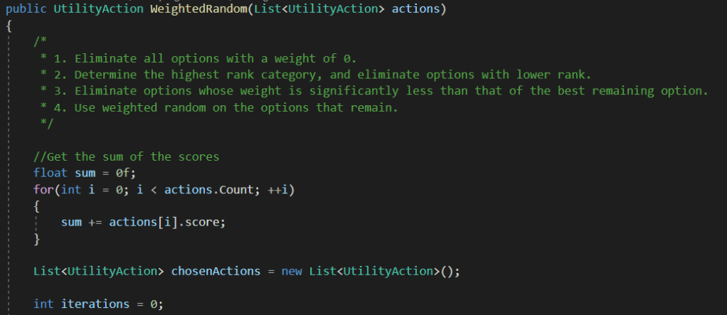 I used a Weighted Random algorithm for this. This uses “weights” or numbers given to the computer based on the board position it’s in and where opponents are facing. The function is a bit long so I will split it up into multiple pictures.